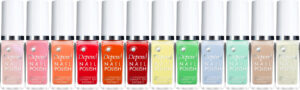 12 farver i alt, der omfatter stærke grønne og koral-farver samt edgy gule, grå og en organge med glimmer.